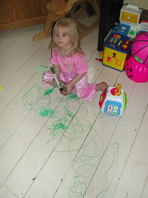 Taylor once painted one of our entry hall walls while Carey and I were working in the yard. She was sitting in a high chair in front of a window so we could see her. We obviously couldnt see what she was doing. She was doing the wall as we had sat her right next to it so that she could be seen through the window. That was before we figured the kid thing out. LOL