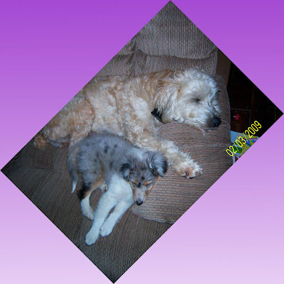 @blueviolet: They wore each other out playing…it’s so cute! π The puppy is definitely fitting right in – he climbed up on the back of the couch today, then fell asleep on my shoulder. He’s growing so fast, he won’t be able to do stuff like that much longer…heh, heh!!