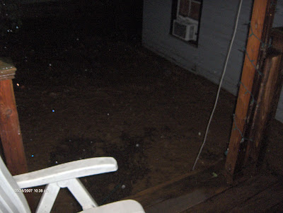 I made a mental note that the case of wine my brother had kindly sent from Seattle the day before was out of harms way in the basement, sitting on top of a cooler, and then decided to look out the back door and see what the water situation was. We couldn’t believe what we saw, our brick patio between the house and the Summer House was completely submerged in rushing water, and the entire back yard looked like one wide river. Princess Nagger lamented when she saw her big yellow ball sailing away on the rapids of the sudden river, but there was nothing we could do. I decided to check on the basement again, and when I looked down the steps, the water was already at the first step at the bottom (about a foot deep).