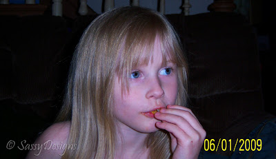 At least by last evening Princess Nagger seemed to have forgotten ‘the worst day of her whole life’ as she happily watched her favorite show and scarfed on baked messy cheddar Sun Chips:
