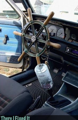 Hey, some of the repairs actually look pretty good. I'd say the toilet paper holder is effective (at least he was able to find a way!), and the steering wheel made of a ship's wheel is actually kinda cute. Haha~